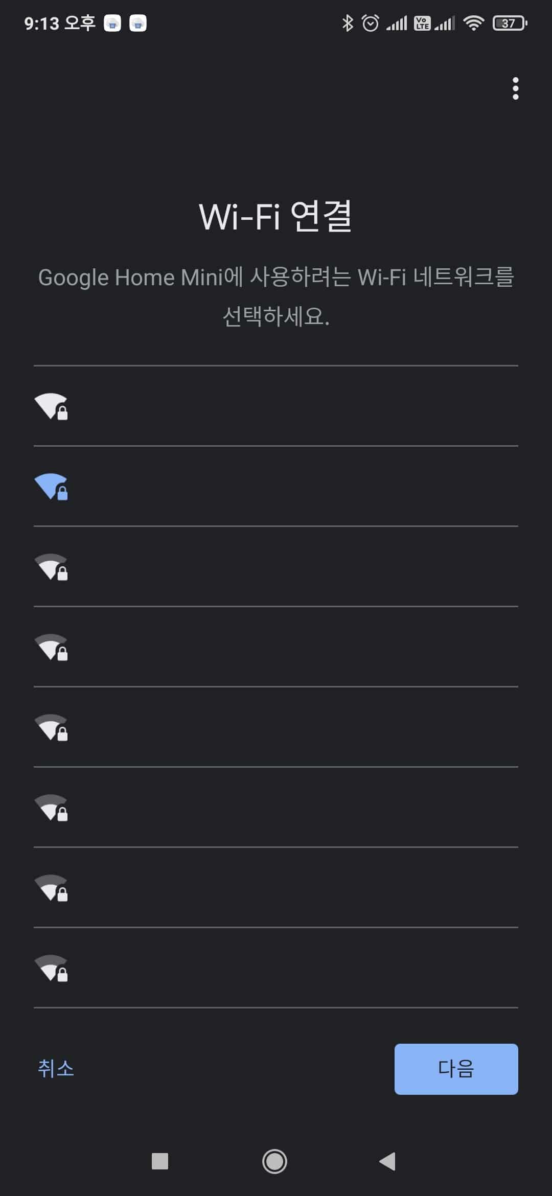 그 후 다음을 누르면 어플이 알아서 주변 구글 홈 미니를 검색해줍니다. 혹시 검색에 실패했어도 홈 화면에서 “Google Home Mini 설정”을 눌러주면 추가해줄 수 있습니다.