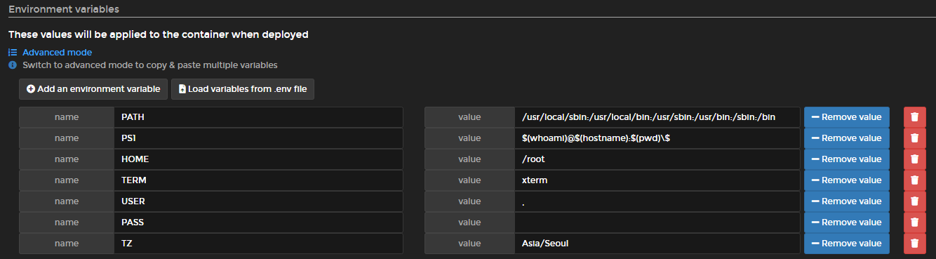(최신 컨테이너의 경우 설정 파일 편집을 통한 설정이 불가능합니다. 때문에 반드시 환경 변수를 이용해 설정해주세요.)
