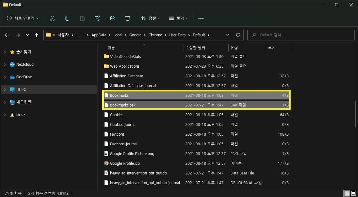 마지막 방법은 크롬 데이터 저장 폴더에서 직접 즐겨찾기 파일을 따로 복사하여 저장해두는 것입니다.